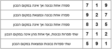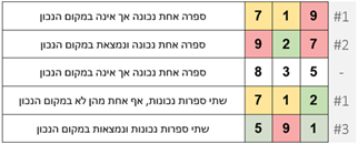 בכל שאלה תקבלו רשימה של רמזים, שבעזרתם עליכם לגלות קוד סודי המורכב מ-3 ספרות. כל ספרה מופיעה לכל היותר פעם אחת בקוד (אין חזרות) ויש בדיוק קוד סודי אחד שמסתדר עם כל הרמזים. השאלות במבחן פתוחות, יש לכתוב את הקוד בתשובה בעזרת ספרות בלבד. במבחן תידרשו להסביר בכמה מילים כיצד הגעתם לפתרון.