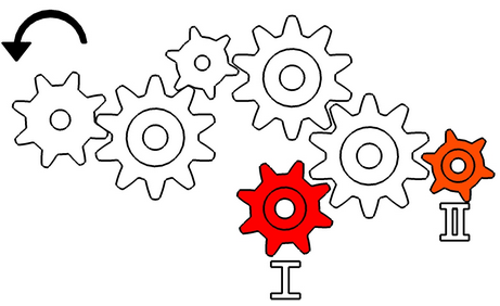 גלגל השיניים הכתום קטן יותר מגלגל השיניים האדום (פחות שיניים). לכן כאשר הגלגל האדום משלים סיבוב אחד, הגלגל הכתום ישלים יותר מסיבוב אחד באותו זמן. מכאן שהגלגל הכתום מסתובב מהר יותר.