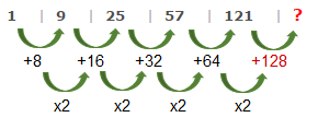 זוהי סדרת הפרשים. ההפרשים בסדרה מוכפלים ב-2 במעבר בין איבר לאיבר בסדרה (64, 32, 16, 8). ההפרש האחרון בסדרת ההפרשים הוא 64, ולכן נכפיל אותו ב-2 על מנת לחשב את ההפרש הבא (64x2=128).