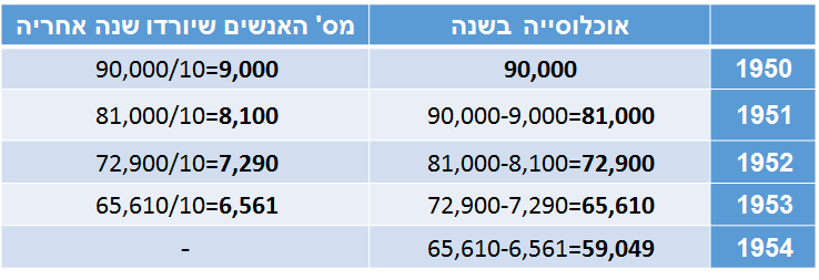 נמצא כמה הם 10% ממספר התושבים בשנת 1950 ונפחית מספר זה כדי לגלות כמה תושבים היו בעיר בשנה העוקבת. נמשיך כך עד שנגיע ל-59,049 תושבים. חשוב לשים לב שבכל שנה השלם משתנה, ובהתאם לכך ה-10% משתנה גם הוא: